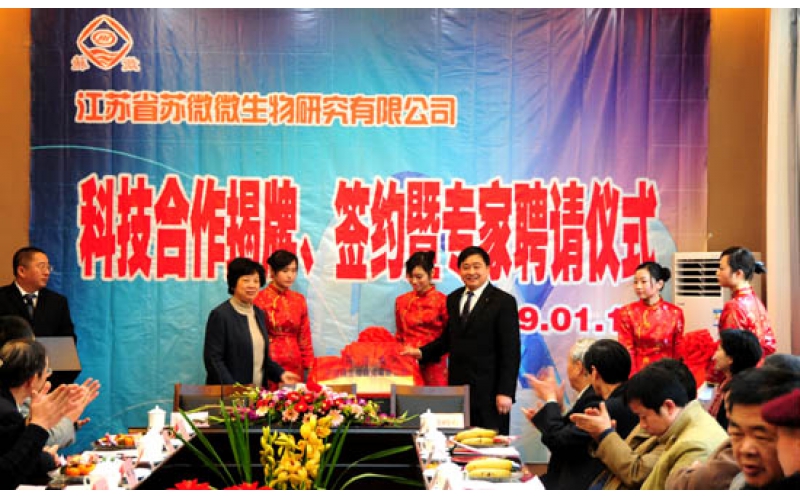 2009年1月16日,江蘇省蘇微微生物研究有限公司隆重舉行科技合作揭牌、簽約暨專家聘請(qǐng)儀式。