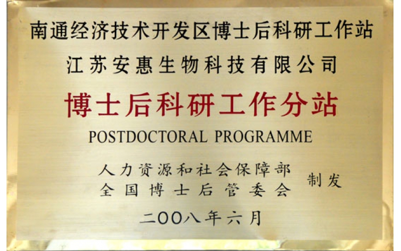 2008年10月15日,安惠公司接受國家人力資源部、社會(huì)保障局、全國博士后管委會(huì)聯(lián)合制發(fā)的“博士后科研工作分站”銅牌。
