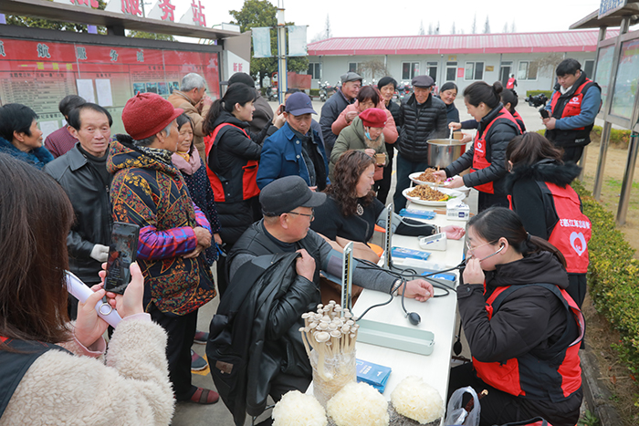在闞家庵村活動中心,黨總支書記陳忠熱情地接待了安惠江海志愿者一行,并簡要介紹村情。縱有春寒料峭,也抵擋不住大家的熱情,學(xué)雷鋒活動吸引了眾多村民前來參加。安惠江海志愿者熱心地為村民們測量血壓,提供健康咨詢。安惠會議中心大廚精心準備了美味的菌菇菜肴:黑椒汁杏鮑菇、糖醋木耳、蛋黃蟹味菇、南瓜茸銀耳,引得村民們連連豎起大拇指:“好吃好吃真好吃!”這些菌菇要怎么烹飪?里面加了什么材料?吃了對人體有什么好處?安惠江海志愿者詳細地為村民們一一解答,并為他們普及“一葷一素一菇”的健康飲食理念。