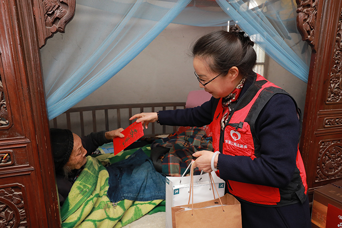 在100周歲的羌蘭芹和101周歲的李永圣兩位老人家中,安惠公司副董事長陸漢萍和他們親切交談,并送上慰問金、芝草玉液酒、博谷茶和菌菇等慰問物資,祝愿他們身體健康、幸福綿長。她說,家有一老,如有一寶,我們要用實際行動多給老人關(guān)心和關(guān)愛,讓所有老人都能有一個幸福美滿的晚年。